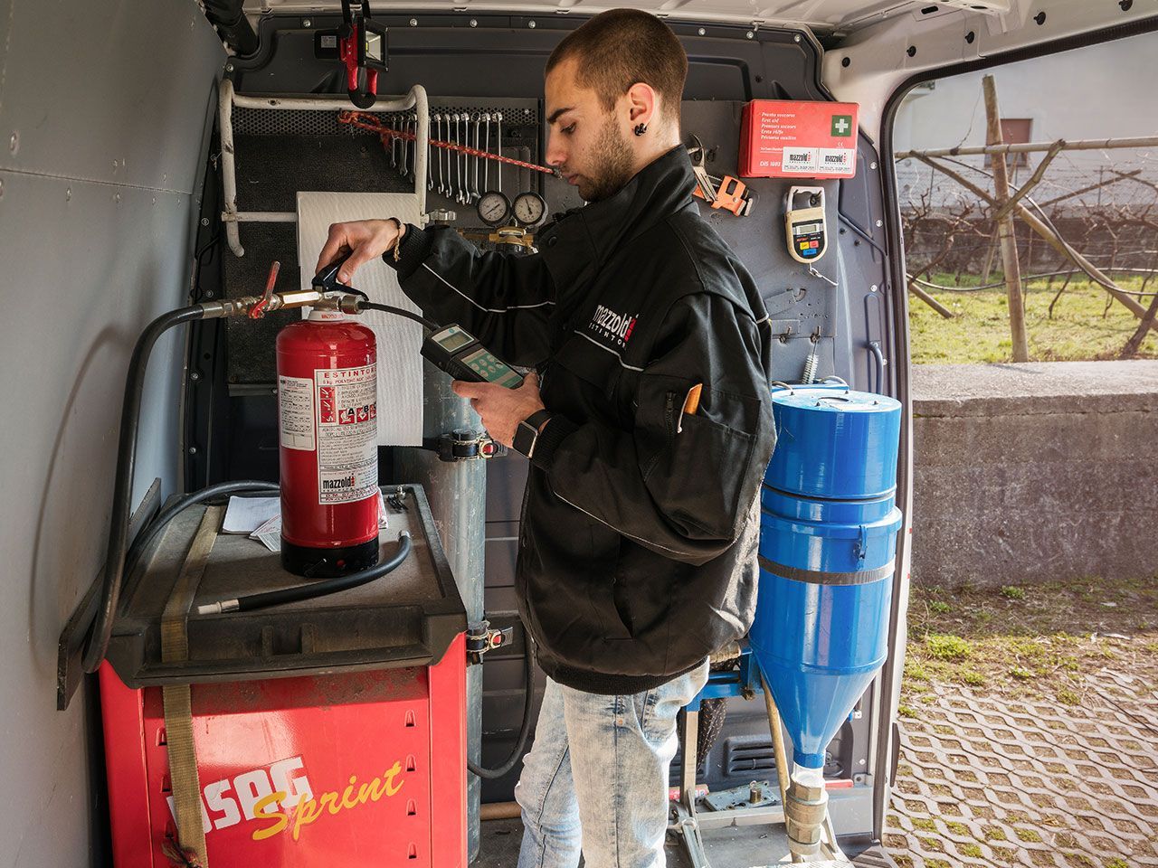 Grazie ai furgoni attrezzati per erogare i servizi previsti dalle normative di riferimento, la verifica periodica e manutenzione delle attrezzature antincendio può essere effettuata presso la sede del cliente oltre che presso l’officina situata nella sede dell’azienda.